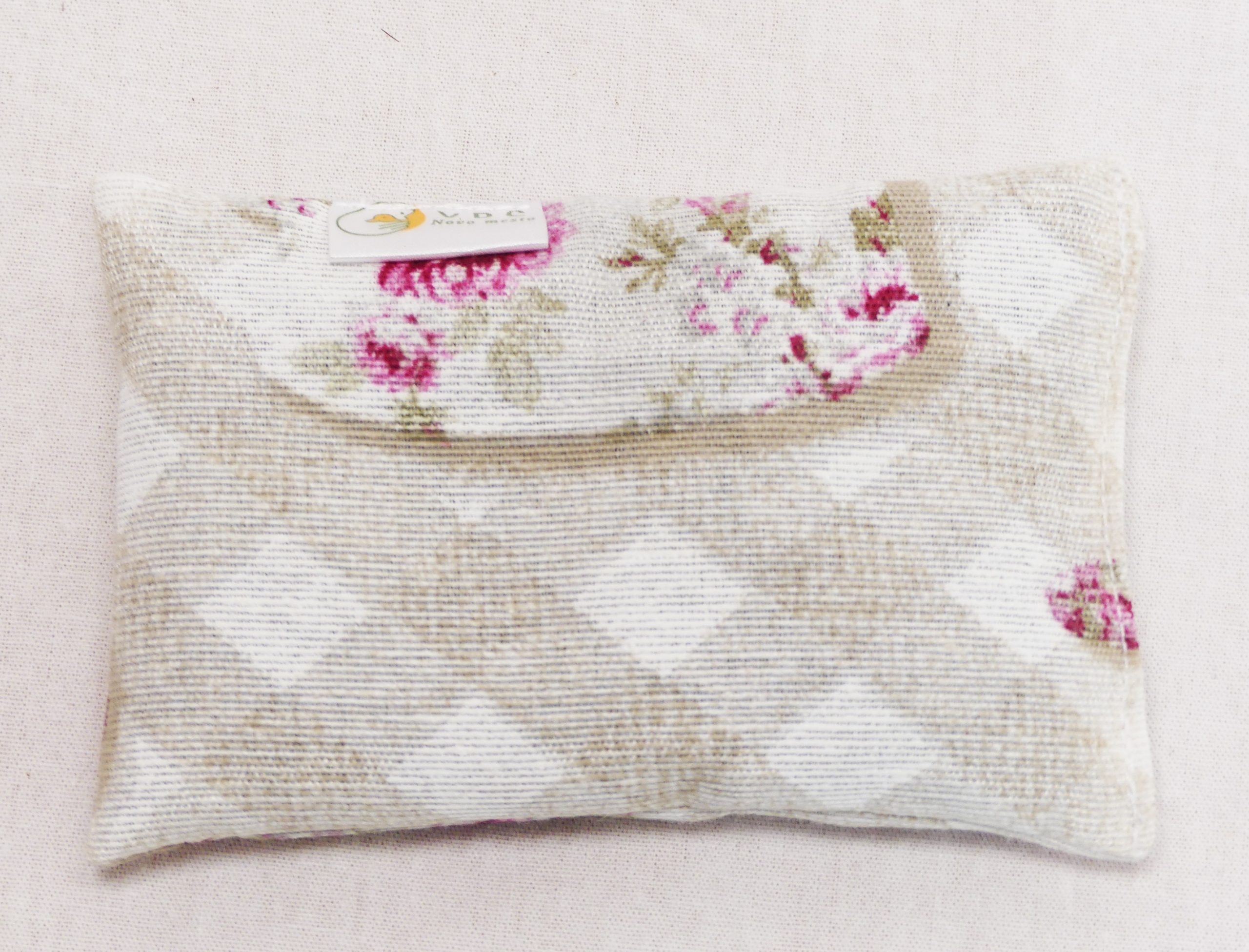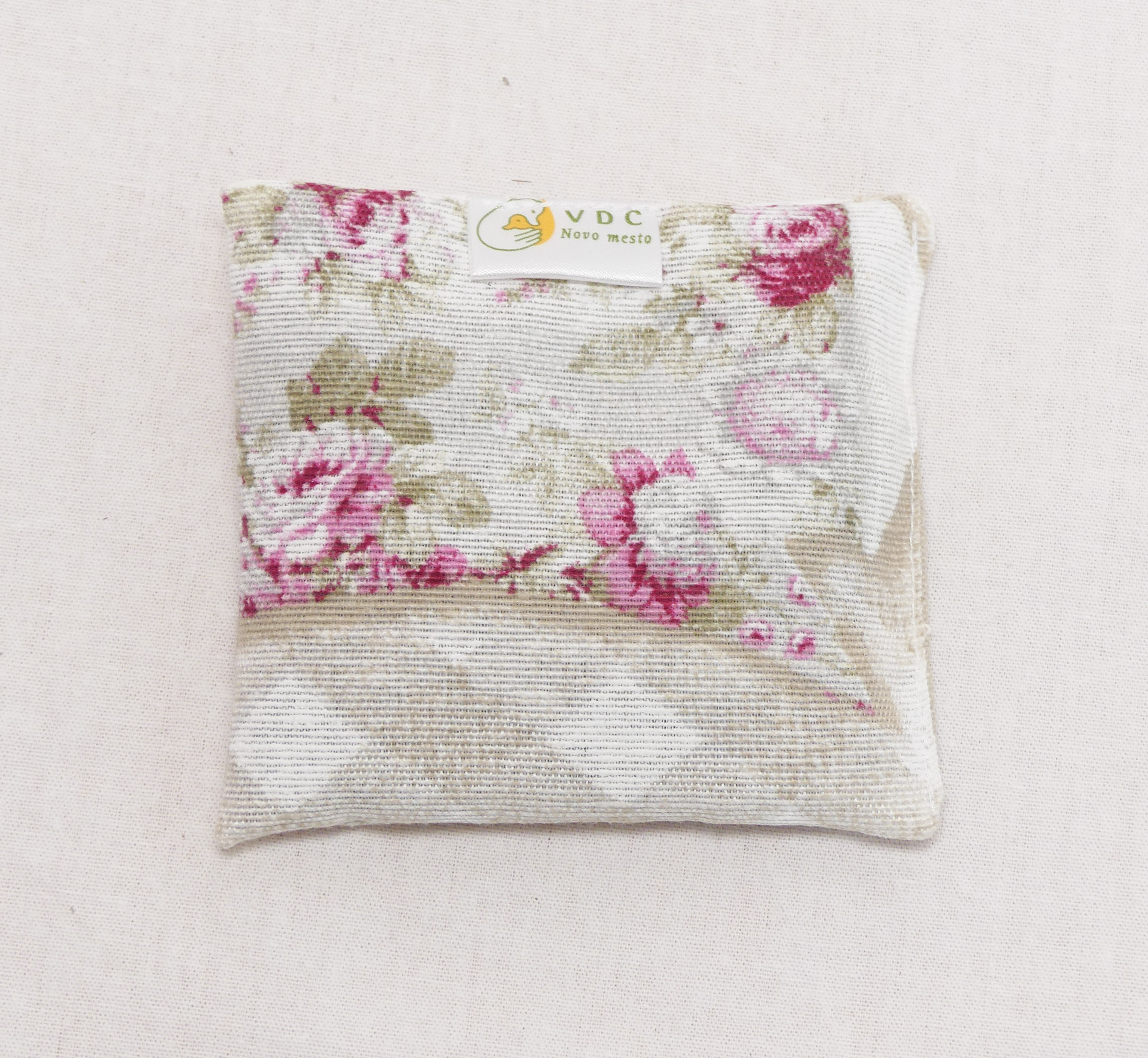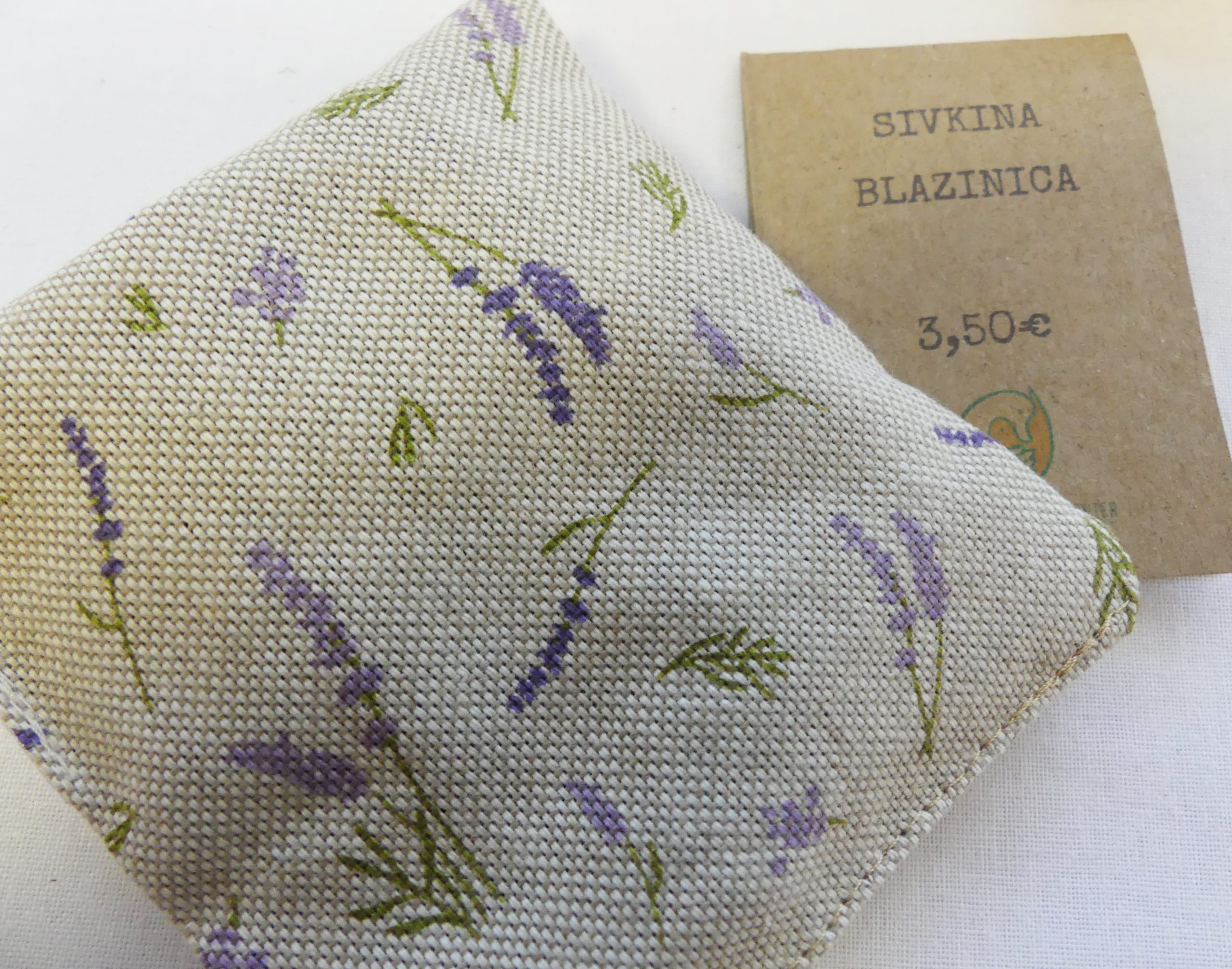 Sivkina blazinica je napolnjena s posušenimi sivkinimi cvetovi, v naravnem blagu s potiskov sivke.