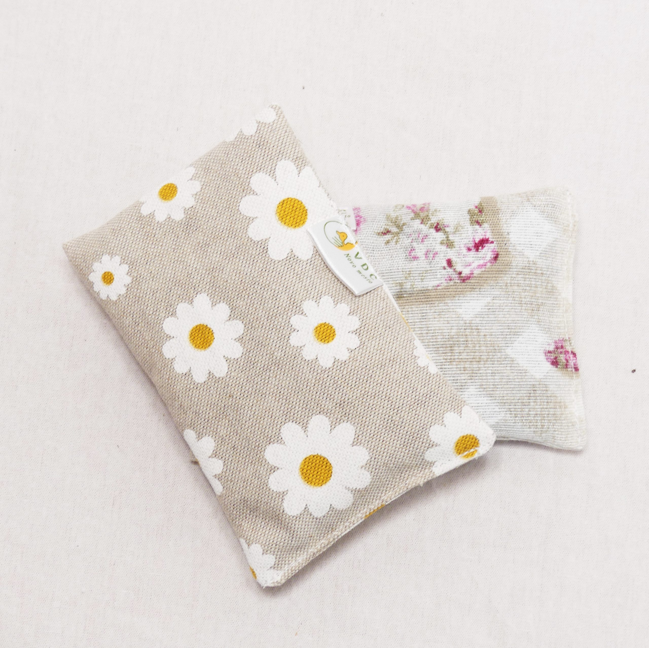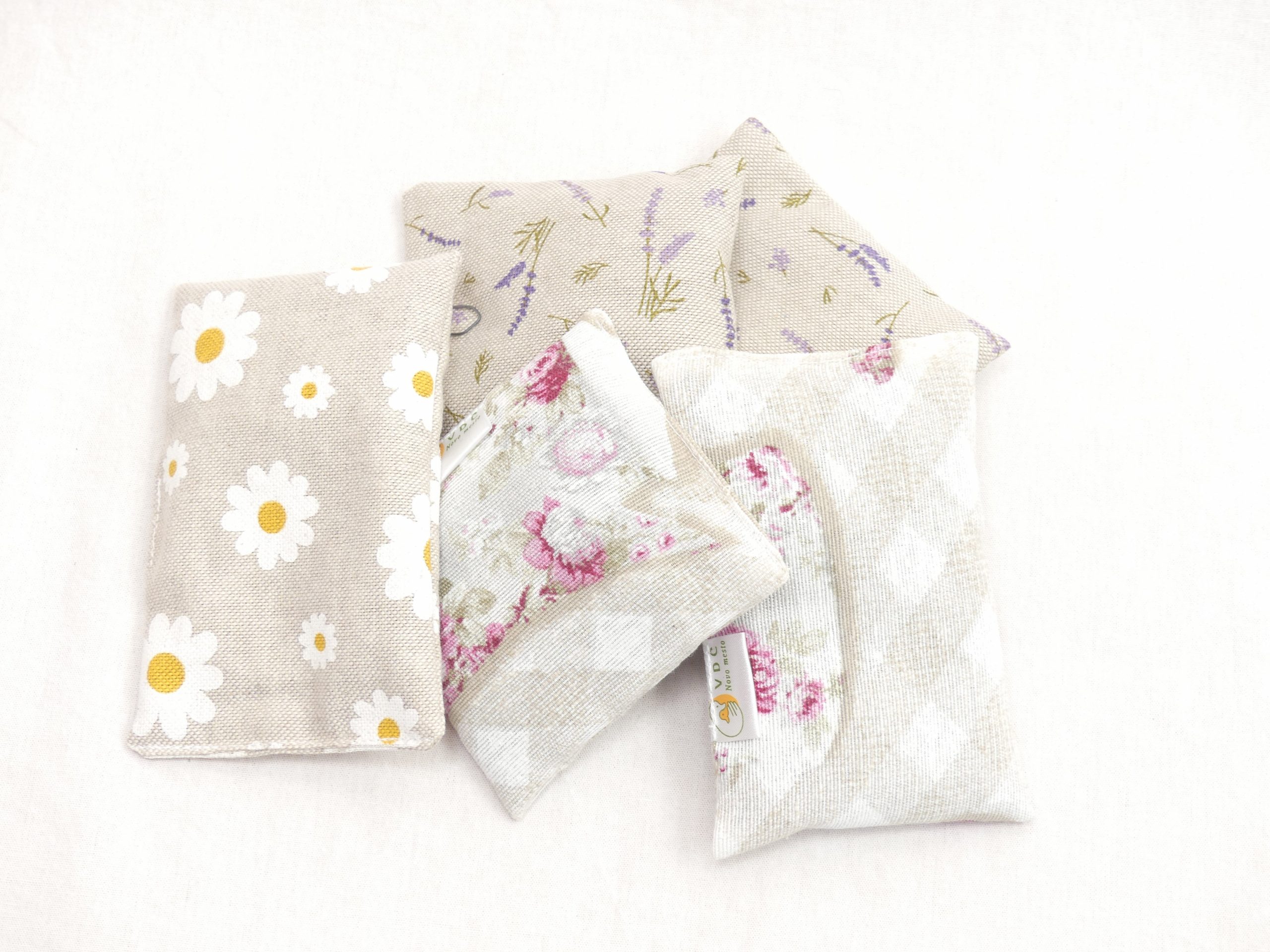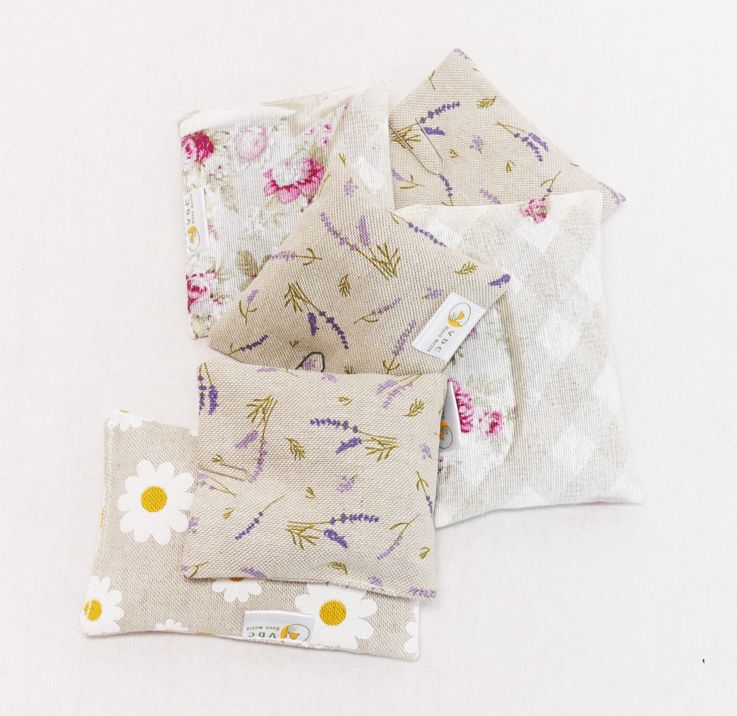 Sivkina blazinica je napolnjena s posušenimi sivkinimi cvetovi, v naravnem blagu s potiskov sivke.